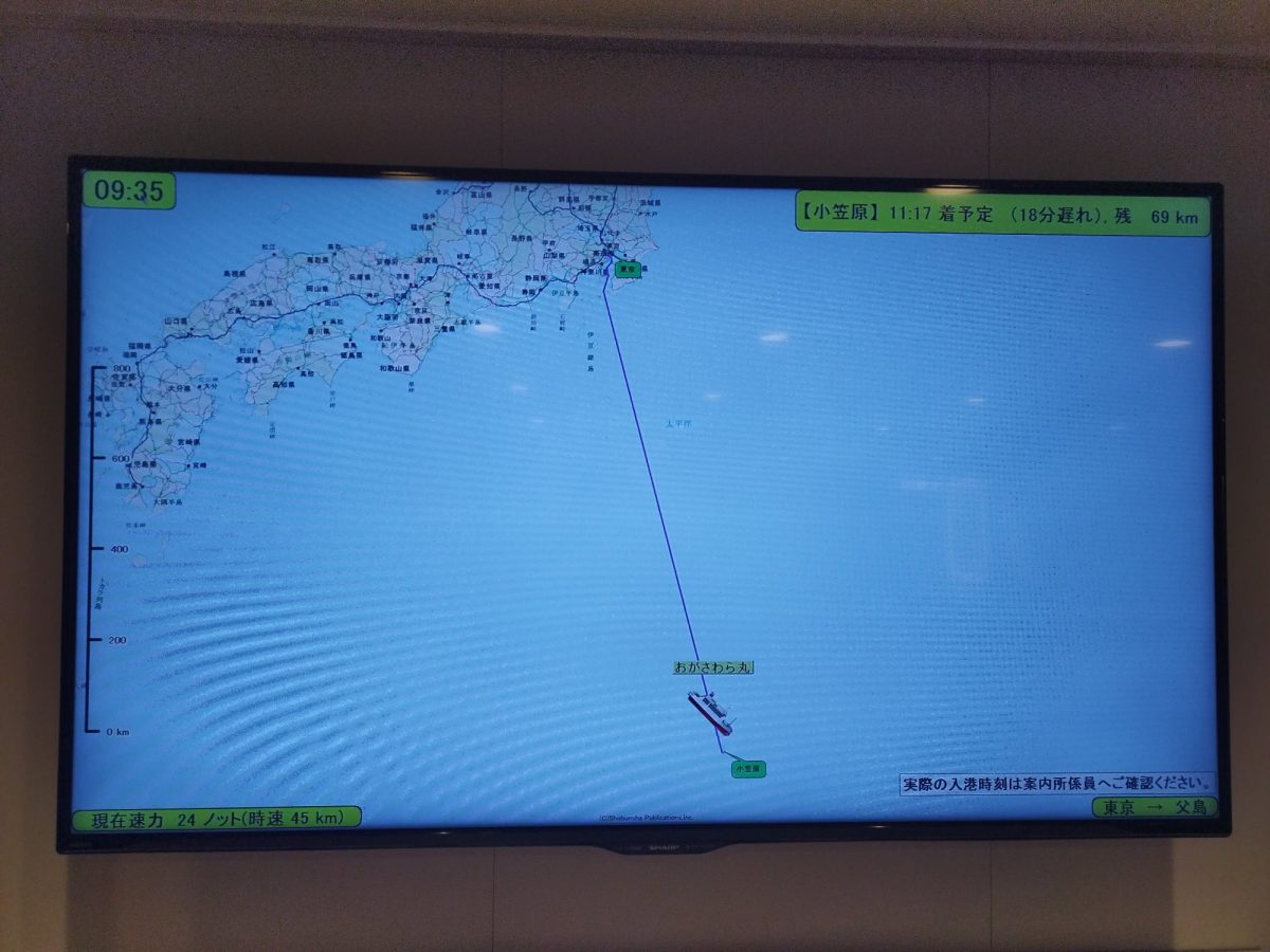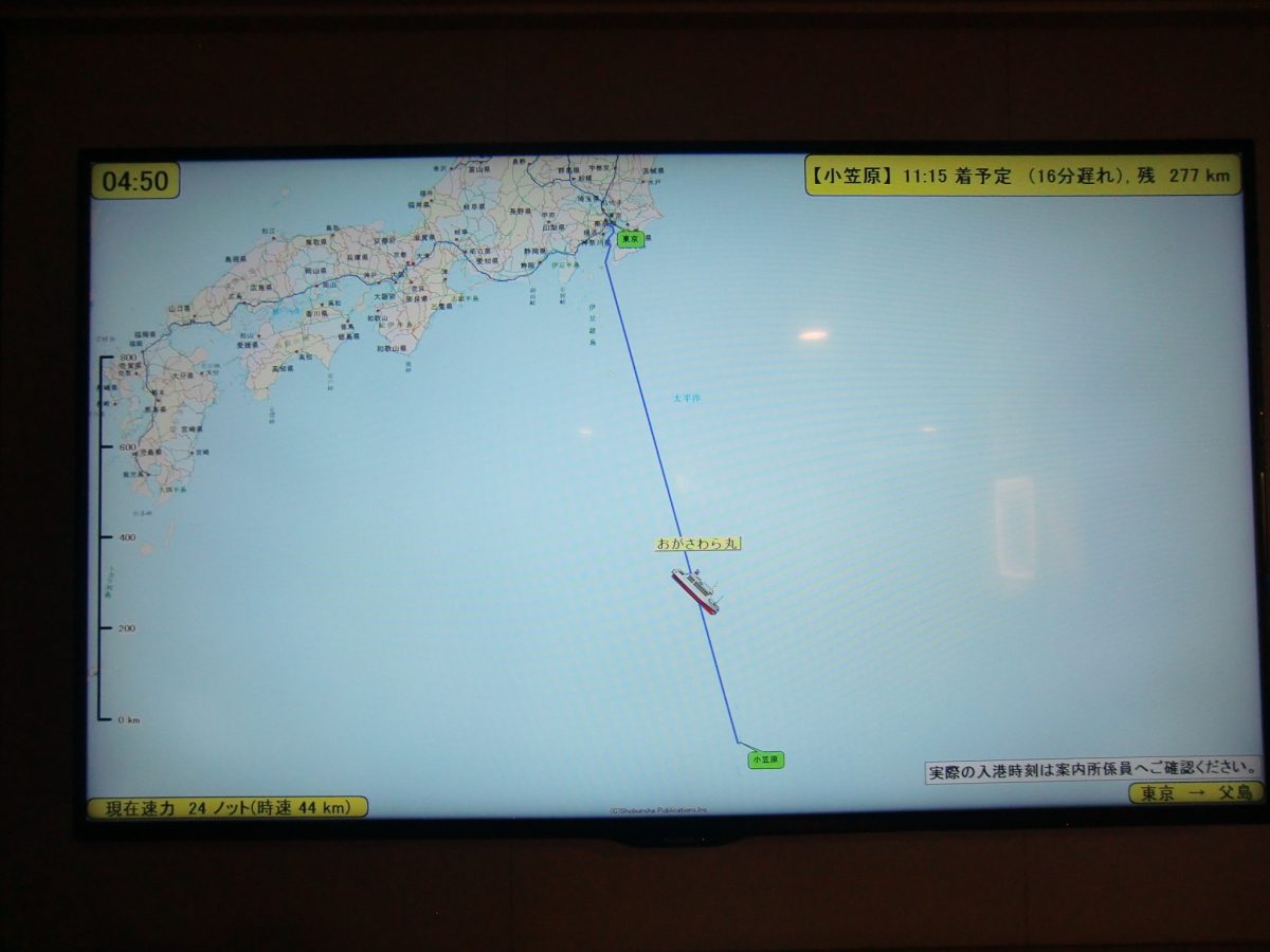 おがさわら丸は航海速力24ノット(45km/h)で航行中。