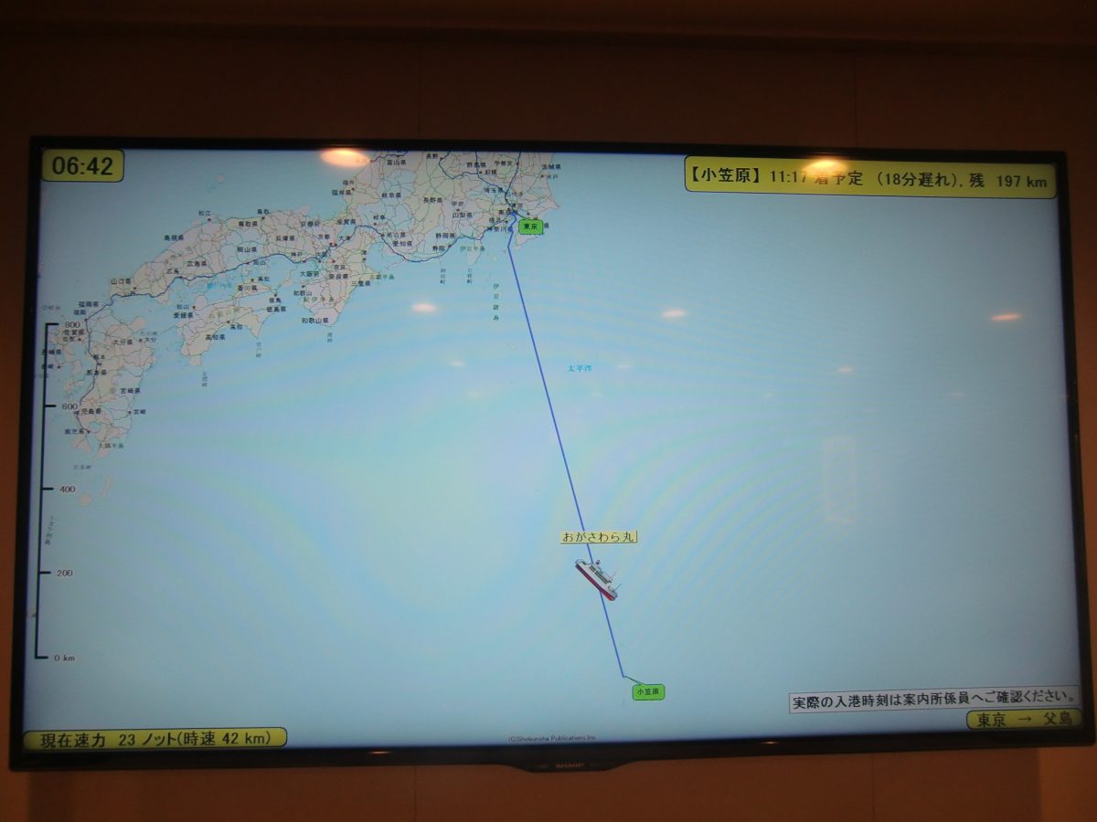 おがさわら丸は航海速力23ノット(42km/h)で航行中。