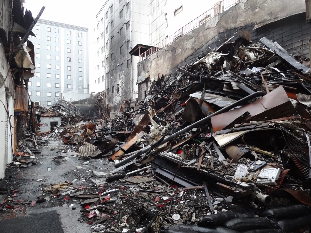 大きな火災があったみたいで、瓦礫が山積みになっていますよ。